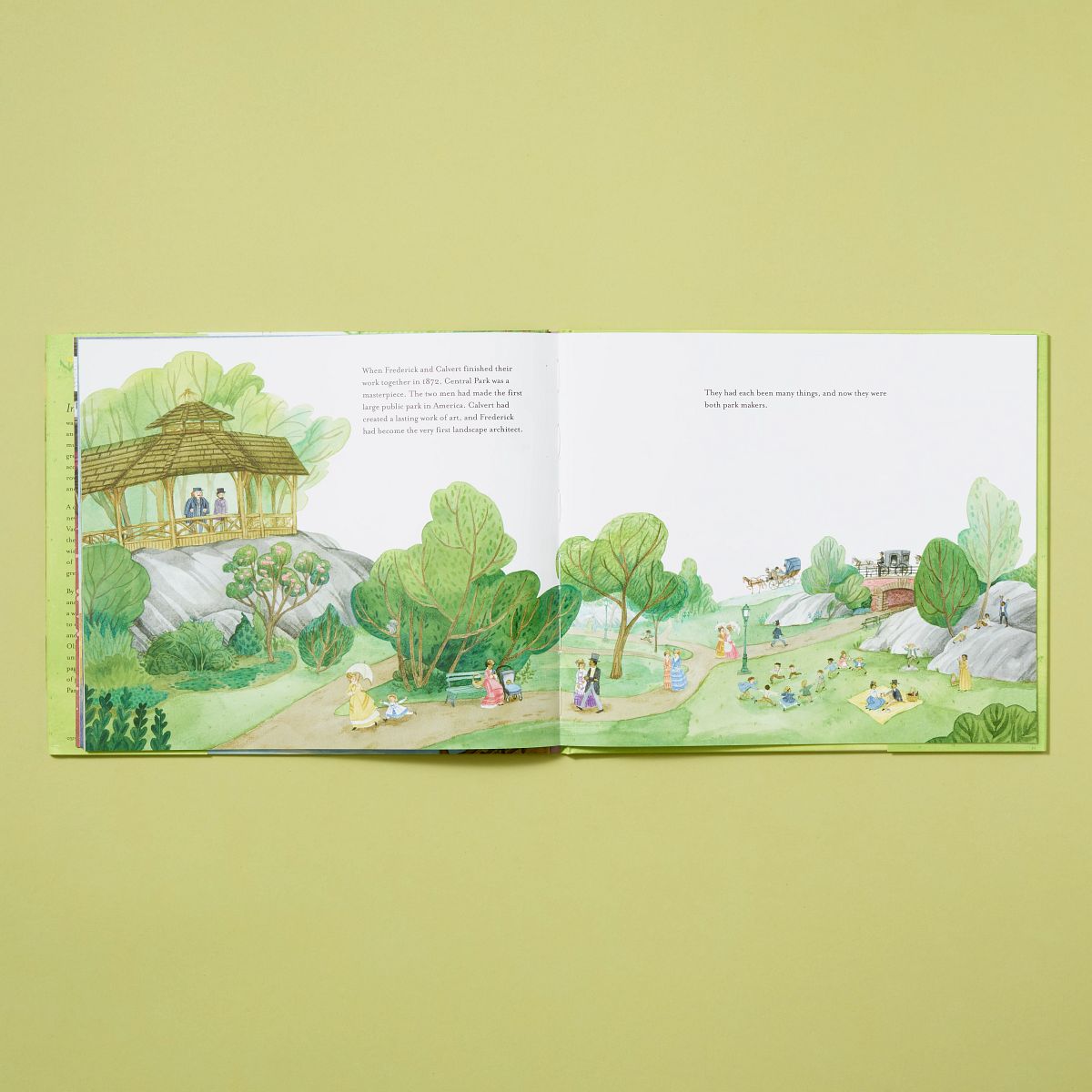 In 1858, New York City was growing so fast that new roads and tall buildings threatened to swallow up the remaining open space. When a citywide contest solicited plans for creating a park out of barren swampland, Calvert Vaux and Frederick Law Olmsted put their heads together to create the winning design, and the hard work of making their plans a reality began. By winter, the lake opened for skating. By the next summer, the waterside woodland known as the Ramble opened for all to enjoy. Meanwhile, sculptors, stone masons, and master gardeners joined in to construct thirty-four unique bridges, along with fountains, pagodas, and band shells, making New York’s Central Park a green gift to everyone. Included in the end matter are bios of Vaux and Olmsted, a bibliography, and engaging factual snippets.